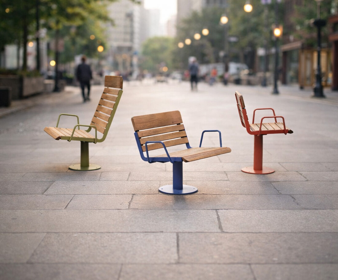 - Urban seating with a swivel function that allows the user to change seating direction, supporting active and personalized use of space.